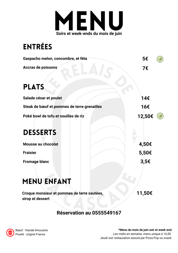 En plat, on ouvre la saison des salades avec la star des salades : La césar, accompagné de poulet. Vous aurez également en plat froid un Poke Bowl de légumes composé et de tofu mariné accompagné de nouilles de riz, de quoi mangé sain et gourmand. Et en troisième plat, l’incontournable steak de bœuf limousin, pommes de terre grenaille et sauce aux herbes.