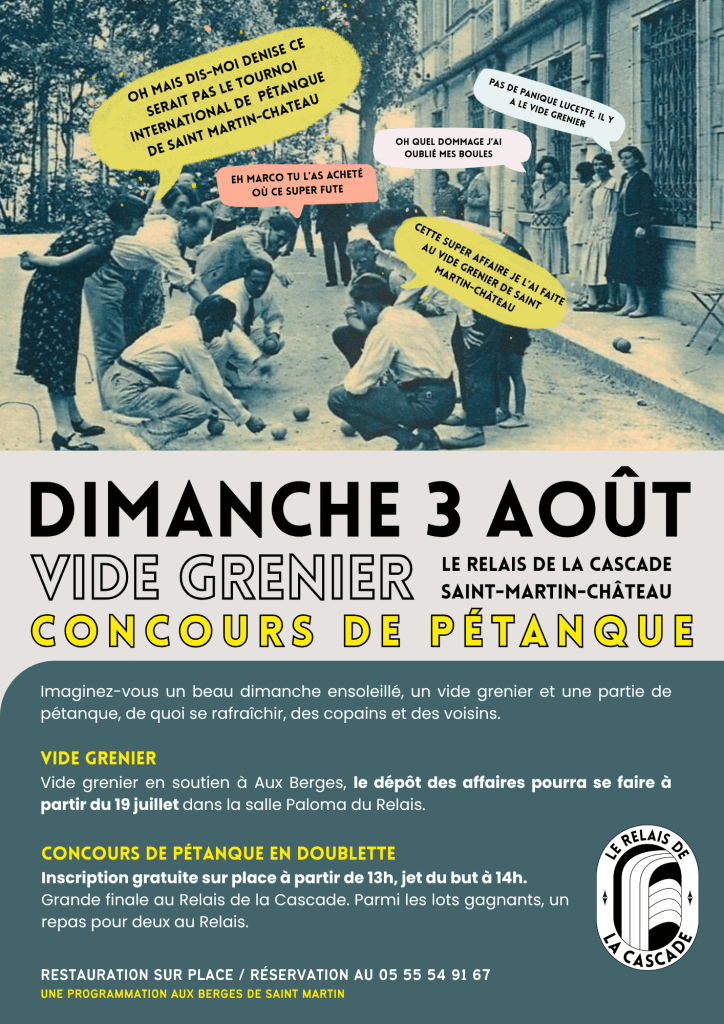Pour le concours de pétanque, c’est des parties en doublette. Inscription gratuite sur place à partir de 13h, jet du but à 14h. Grande finale sur le terrain de pétanque du Relais de la Cascade. Parmi les lots gagnants, un repas pour deux au Relais.
